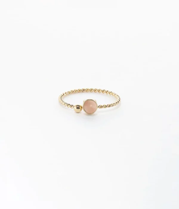 Bague fine ajustable dont l’anneau en acier doré à l’or fin est torsadé et serti d’un cabochon de pierre naturelle.