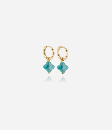 Boucles d’oreilles créoles en acier doré à l’or fin par ionisation sur lequel est attachée un trèfle en verre.