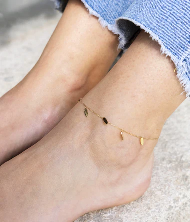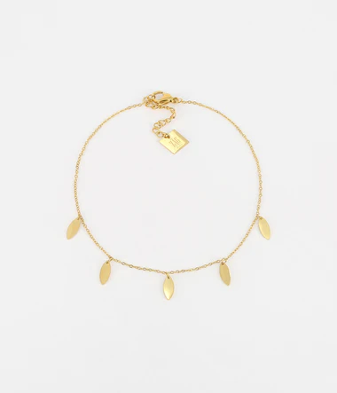 Similaire à notre incontournable chaîne de cheville Confettis, cette nouvelle pièce en acier uni ou doré à l’or fin est composée de petites pampilles plates en métal imitant une feuille de thé.