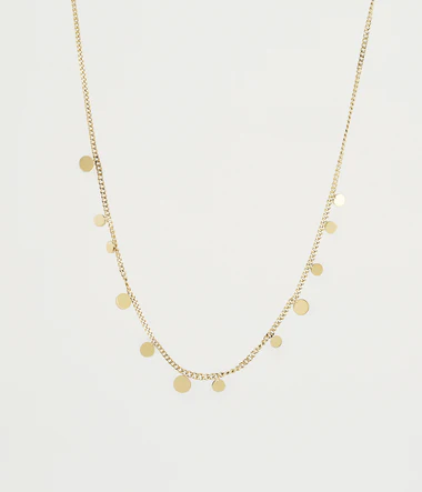 Collier maille gourmette en acier uni ou doré à l’or fin par ionisation sur lequel sont attachées des pampilles de métal comme des petits confettis.