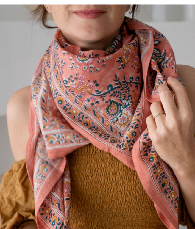 Je suis un carré coloré et imprimé à la main sur un tissu doux et léger, qui enveloppera votre cou pour un style boho-chic irrésistible !