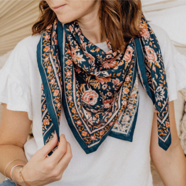 Je suis un carré coloré et imprimé à la main sur un tissu doux et léger, qui enveloppera votre cou pour un style boho-chic irrésistible !