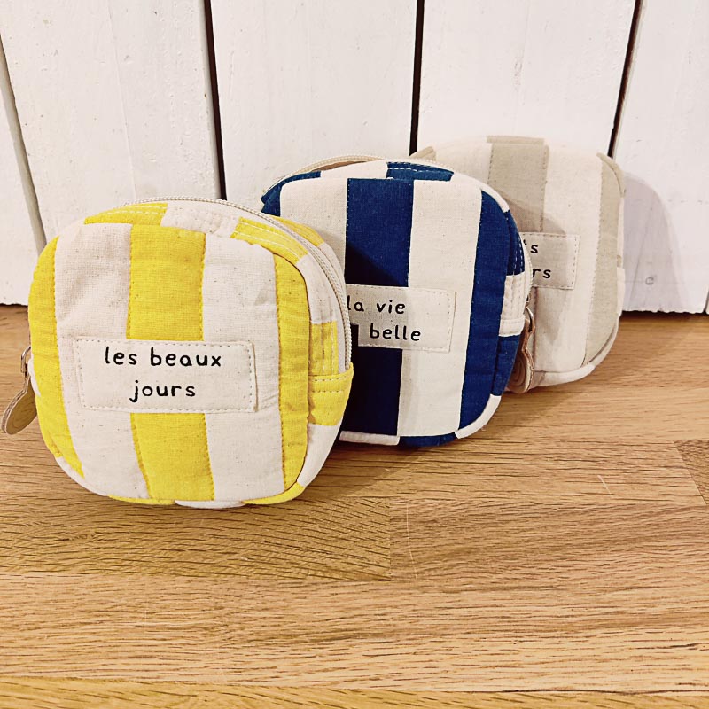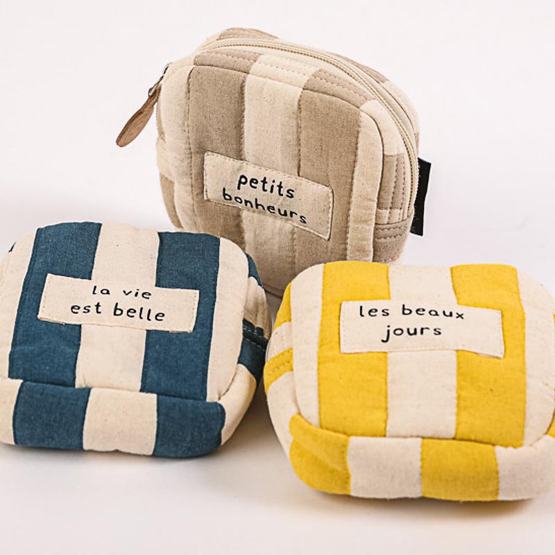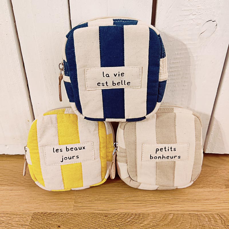 Je suis conçu pour accueillir vos petites affaires avec élégance et simplicité. Compact et léger, je vous accompagne au quotidien, offrant une touche raffinée à votre style. Mes rayures discrètes et mes doux messages vous rappellent que chaque instant mérite d’être savouré.