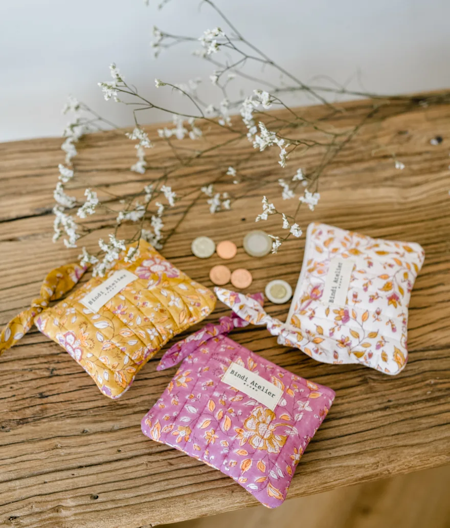 Je suis votre compagnon idéal pour garder vos pièces, billets et petites cartes bien organisés. Compact et léger, je me glisse facilement dans votre sac tout en apportant une élégante touche bohème à votre quotidien. Mon tissu en coton matelassé, imprimé à la main selon la tradition du Blockprint, raconte une histoire d’artisanat et de finesse.