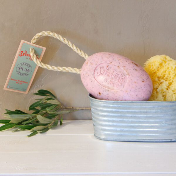 Coucou, je suis le savon exfoliant corde 220 g, aux pétales de rose ! – Mmmmh. 🌹