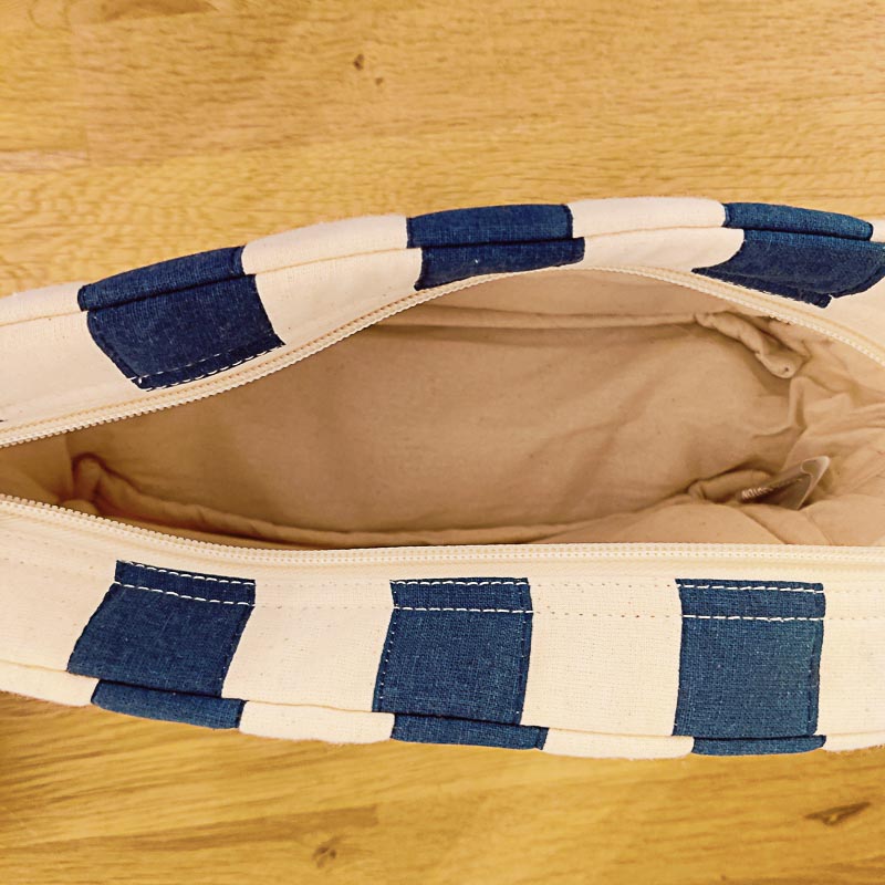 Je suis une trousse en coton matelassé, légère et élégante, pensée pour vous accompagner lors de vos escapades ou au quotidien. Mes rayures douces et ma fermeture éclair sécurisée protègent vos essentiels avec style. Que ce soit pour un week-end ou pour organiser vos petits objets, je suis là pour vous simplifier la vie.